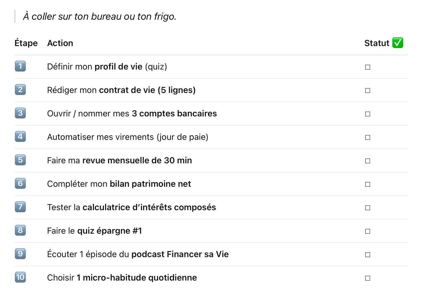 💡 Astuce : écris ton contrat de vie – 5 lignes pour dire ce que tu veux financer dans les 3 prochaines années.