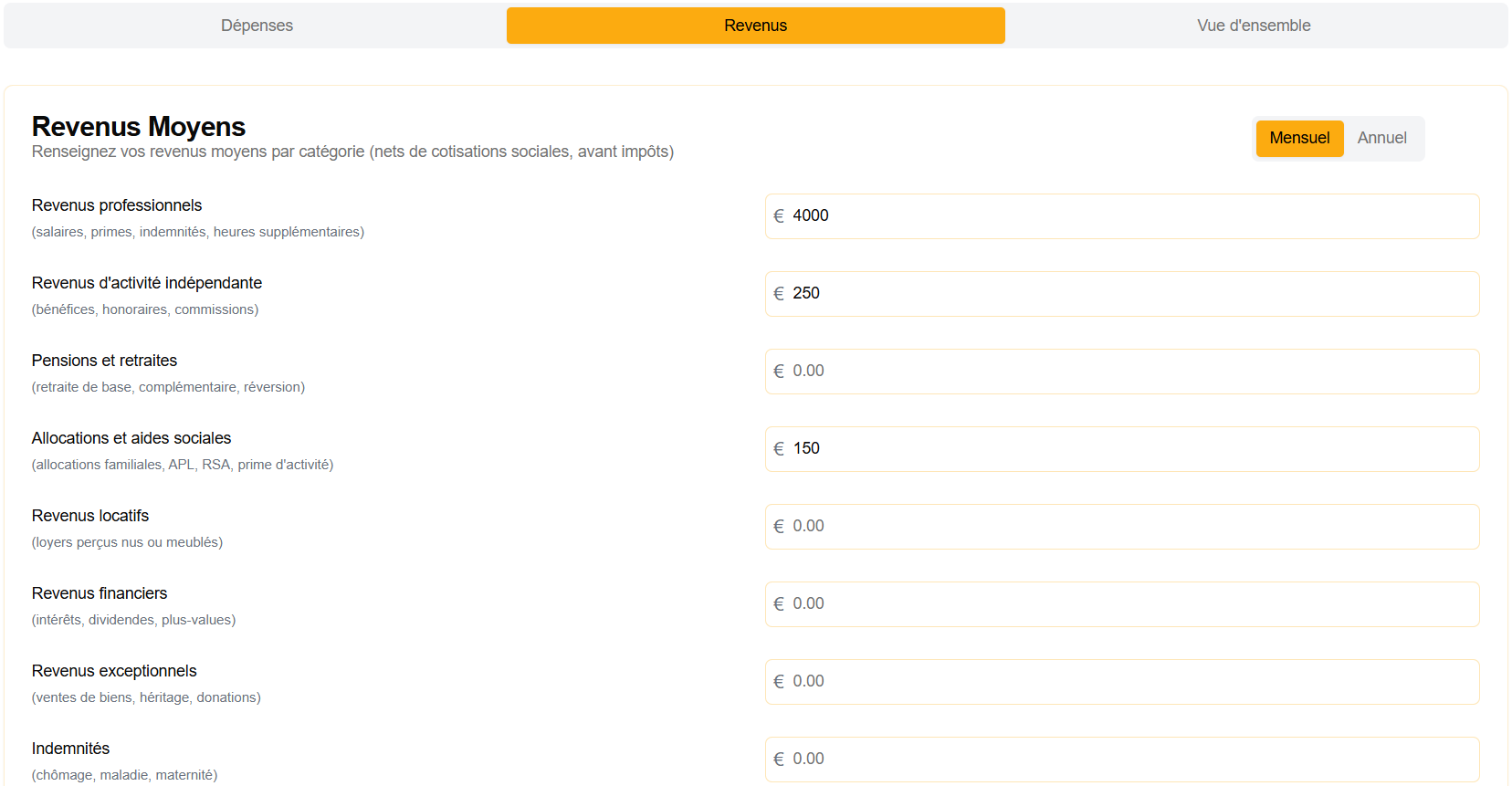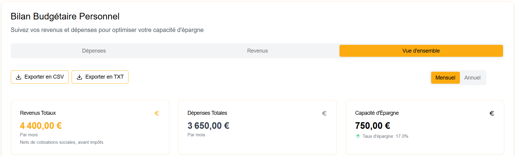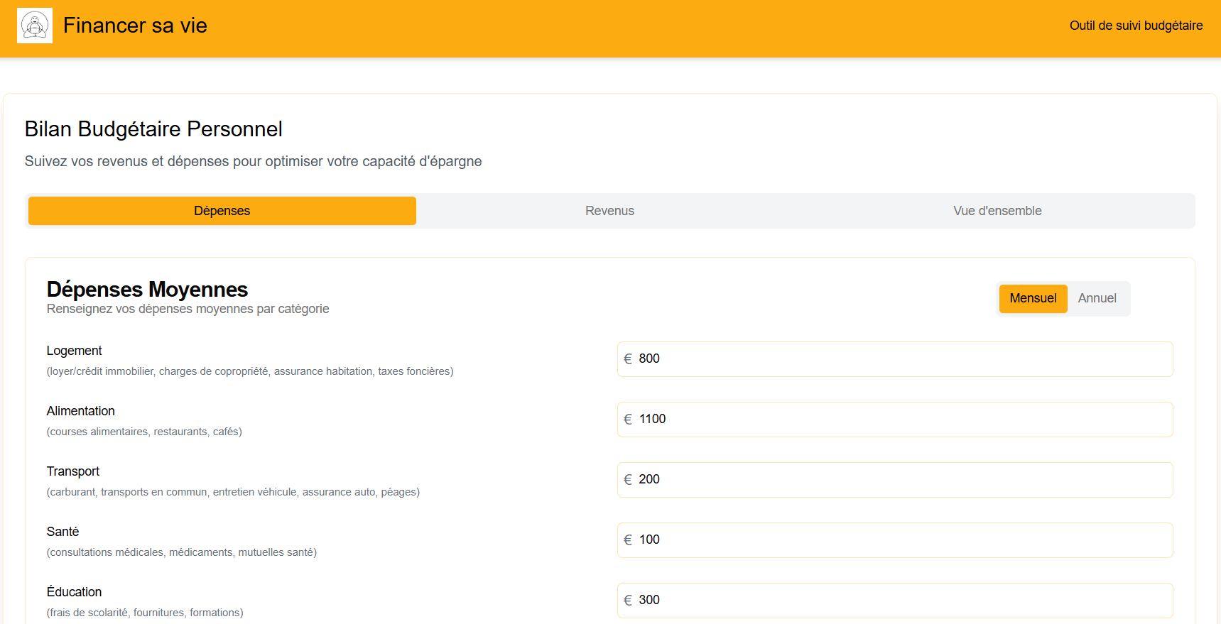 Elle va vous aider Ă dĂ©terminer clairement votre capacitĂ© dâĂ©pargne mensuelle en Ă©valuant vos dĂ©penses et vos revenus. Vous pourrez saisir vos montants moyens de dĂ©penses et de revenus par catĂ©gorie.